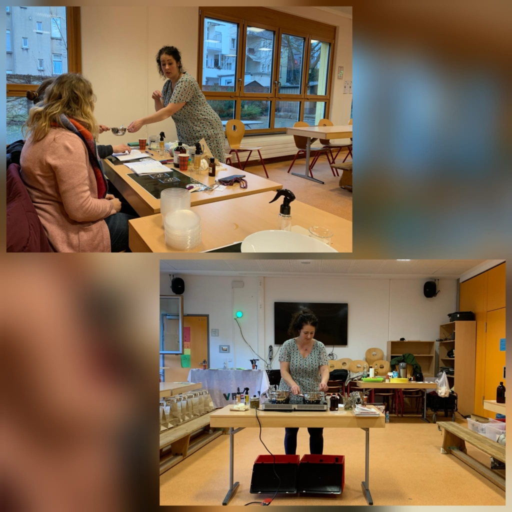 Angeleitet durch die Referentin Sandra Walter („Krautbar“) konnten die Teilnehmerinnen nach vorheriger Abfrage drei Produkte herstellen. Es wurde deutlich, wie mit einfachen und natürlichen Zutaten pflegende Naturprodukte entstehen können. Es entstanden Seifen, eine Schüttellotion und Augenpads.